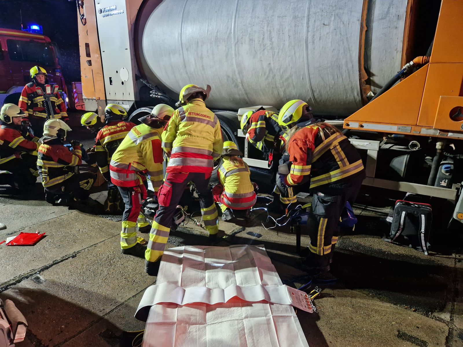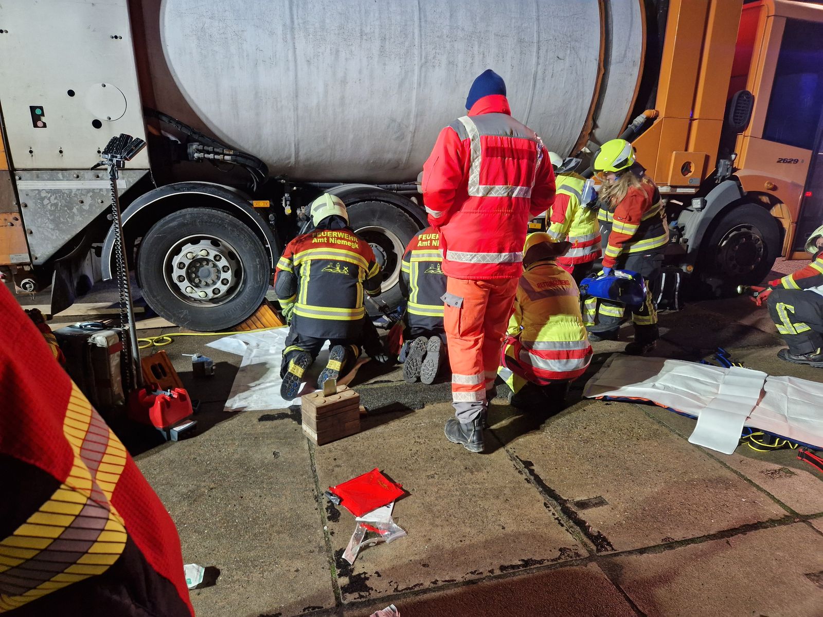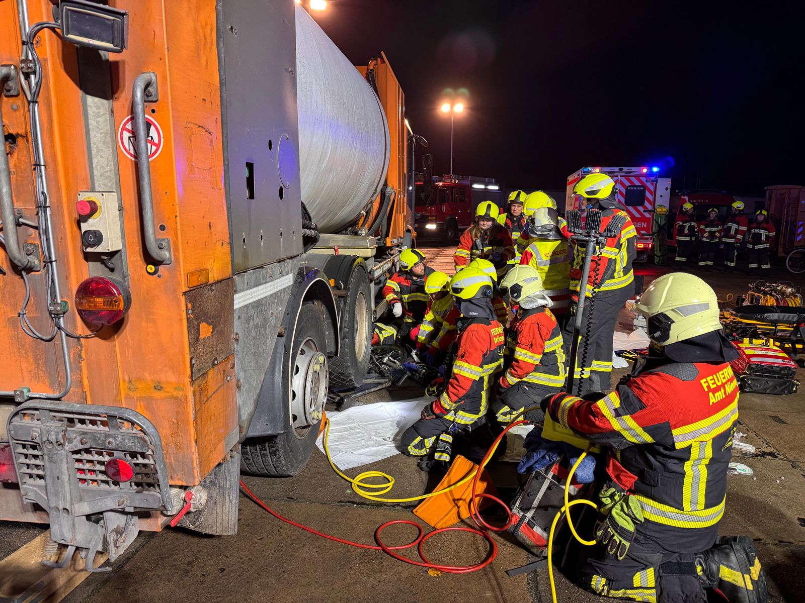 Nun musste schnell und sicher der Einsatz und die Rettung organisiert werden. 27 Kameraden kamen zum Einsatz und kümmerten sich um den Verletzten, zum Glück nur ein Dummy. Es kam schwere Technik zum Einsatz. Dabei wurde ein Teil des LKWs angehoben, um den Verunglückten zu befreien.