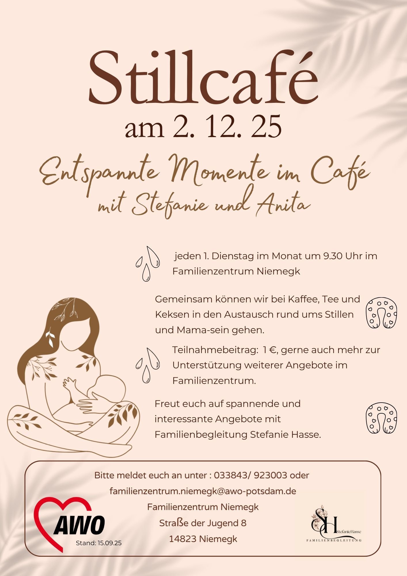 Das nächste Stillcafé findet am 02.12.2025 statt. Um 9:30 Uhr ist Treffpunkt im Familienzentrum. (Flyer im Anhang)