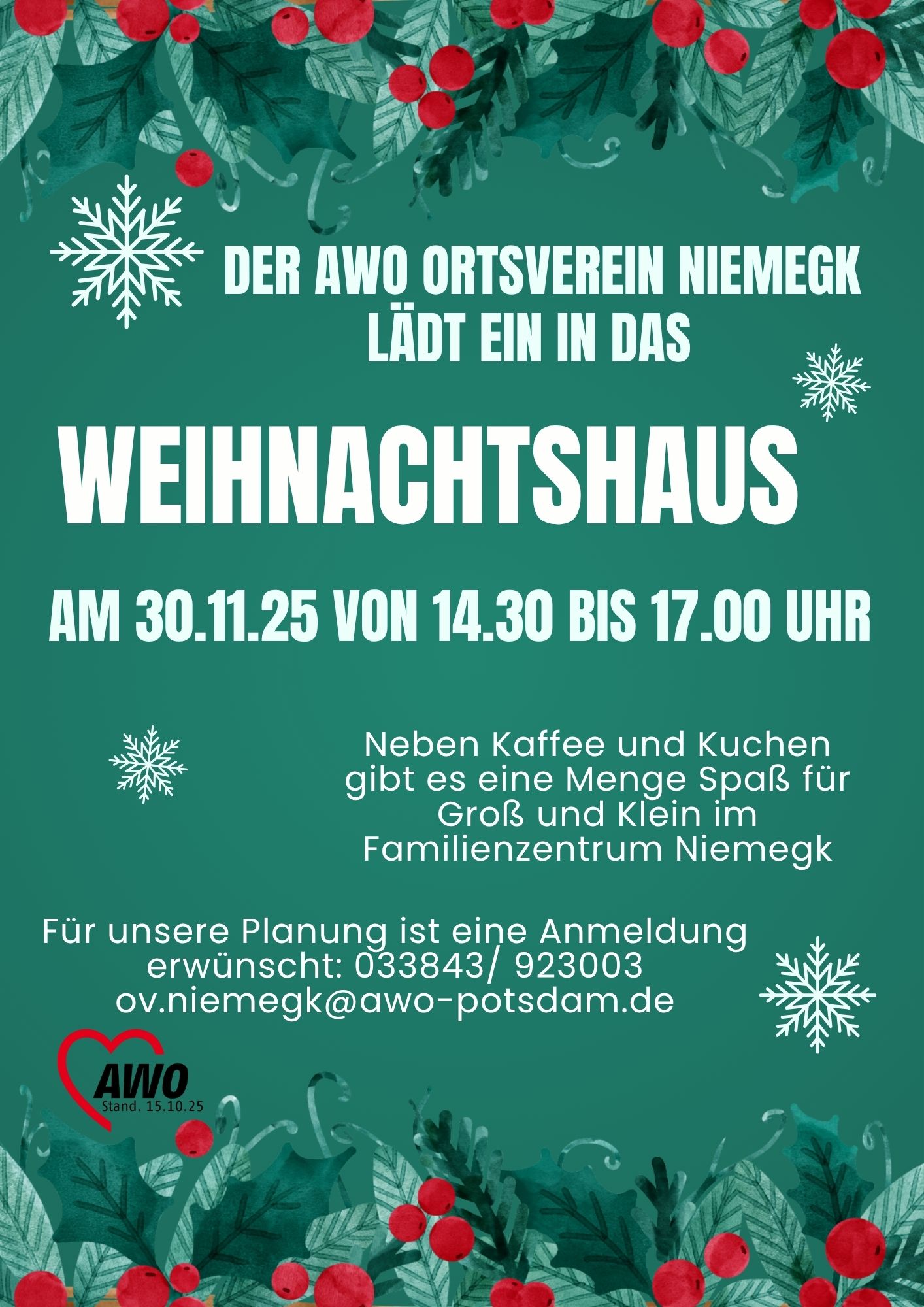 Am 30.11. 2025 findet das „Weihnachtshaus“, organisiert vom AWO-Ortsverein Niemegk e.V. statt. Ab 14:30 Uhr gibt es Kaffee und Kuchen, Glühwein und Plätzchen zum Verzieren bei uns im Familien. Der Flyer hier.