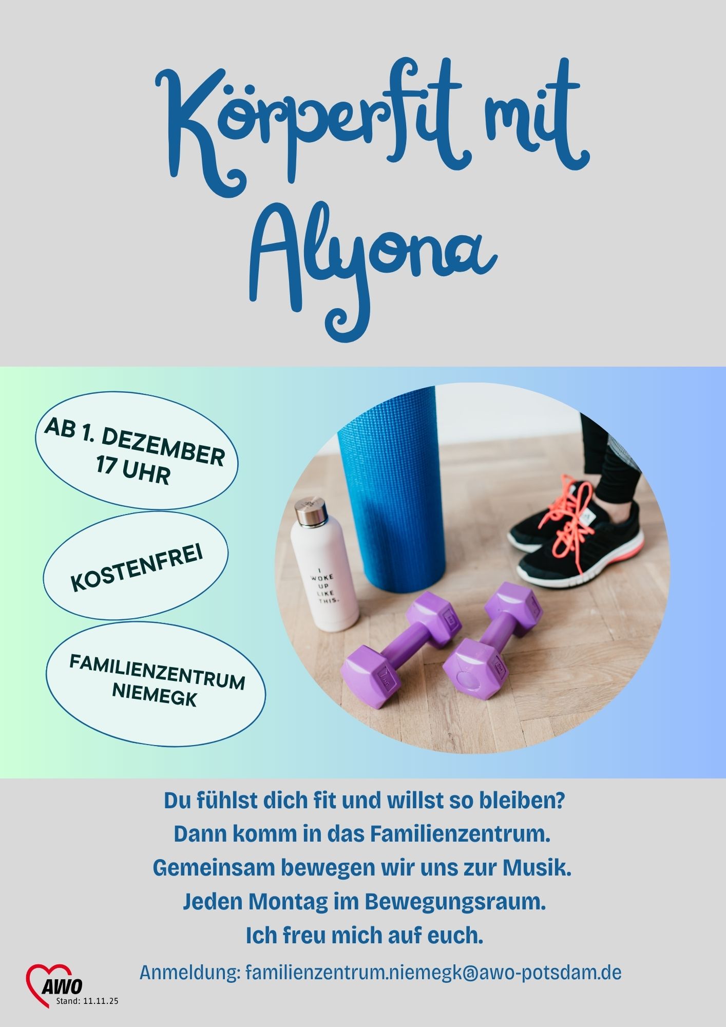 Ab den 01.12.2025 startet ein neues Angebot. „Fit sein und Fit bleiben“ mit Alyona im Bewegungsraum des Familienzentrums. Um 17:00 Uhr geht’s los. (Flyer im Anhang)