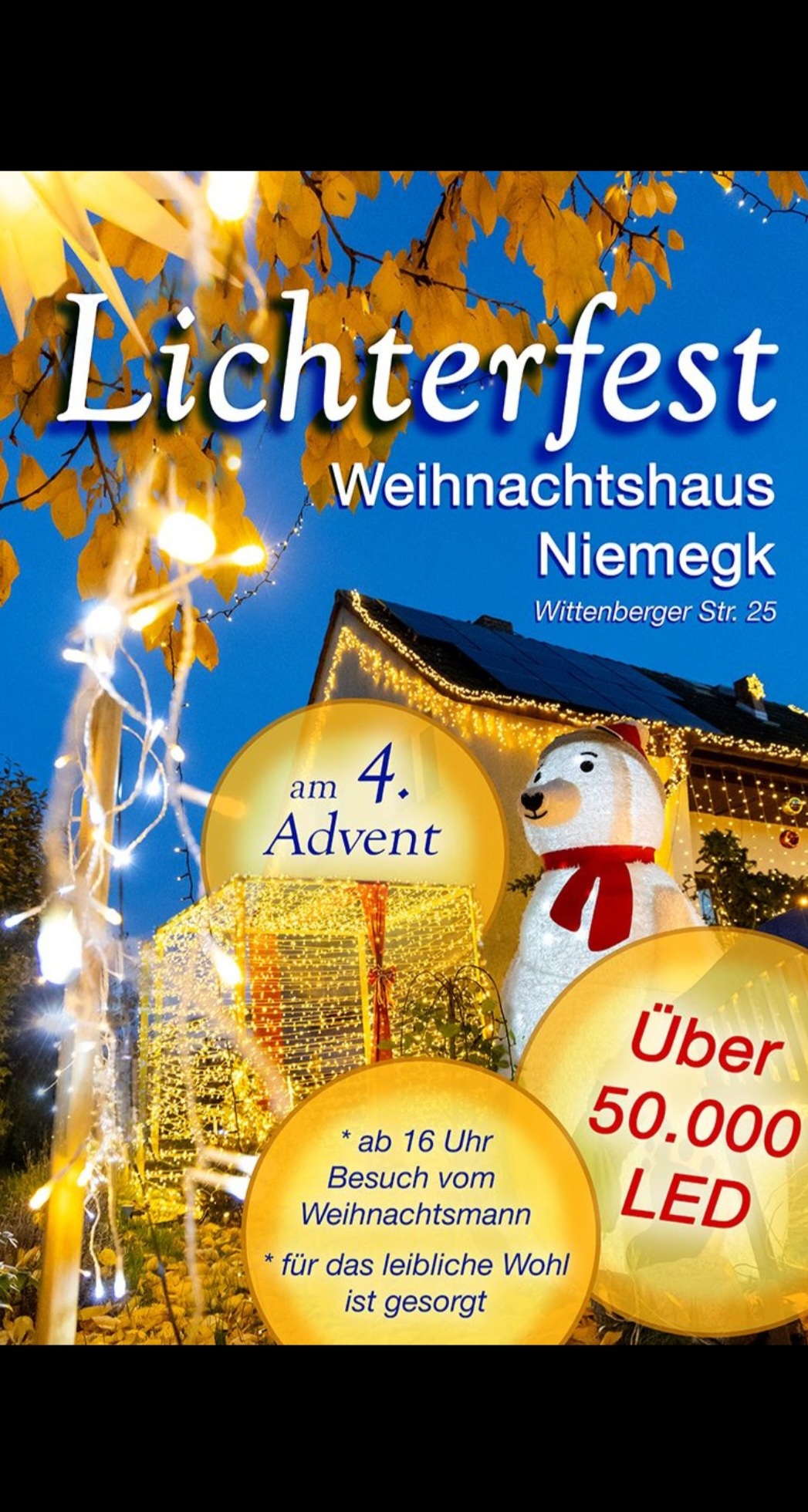 Ein besonderes Angebot ist das Lichterfest im Weihnachtshaus Niemegk am 21.12.2025 in der Wittenberger Str. 25. Ab 16:00 Uhr gibt es Getränke und Speisen und den Weihnachtsmann. (Flyer im Anhang)