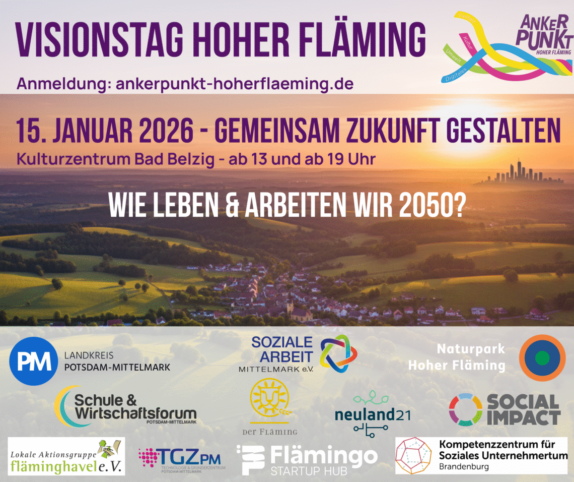 Der ANKERPUNKT HOHER FLÄMING möchte nun gemeinsam mit vielen Partnern einen Schritt weitergehen – mit dem VISIONSTAG HOHER FLÄMING: Wie sieht gutes Leben und Arbeiten im Jahr 2050 aus? Wie können wir Standort-Attraktivität und Lebensqualität steigern?