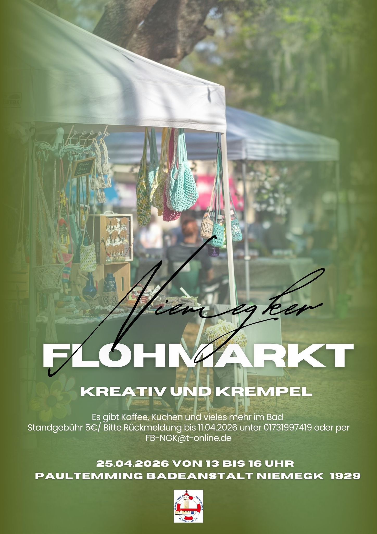 Niemegker Flohmarkt „Kreativ und Krempel“ an der Paul Temming Badeanstalt + Zu Google Kalender hinzufügen + iCal / Outlook exportieren 00 Tage 00 Stunden 00 Minuten 00 Sekunden Datum 25. April 2026 (Samstag) Uhrzeit 13:00 - 16:00 Standort Vorm Schwimmbad, Schützenplatz Veranstalter Förderverein Badeanstalt Niemegk 1929 e.V., Straße der Jugend 7 14823 Niemegk E-Mail FB-NGK@t-online.de Webseite https://badeanstalt-niemegk.de/ Teile diese Veranstaltung