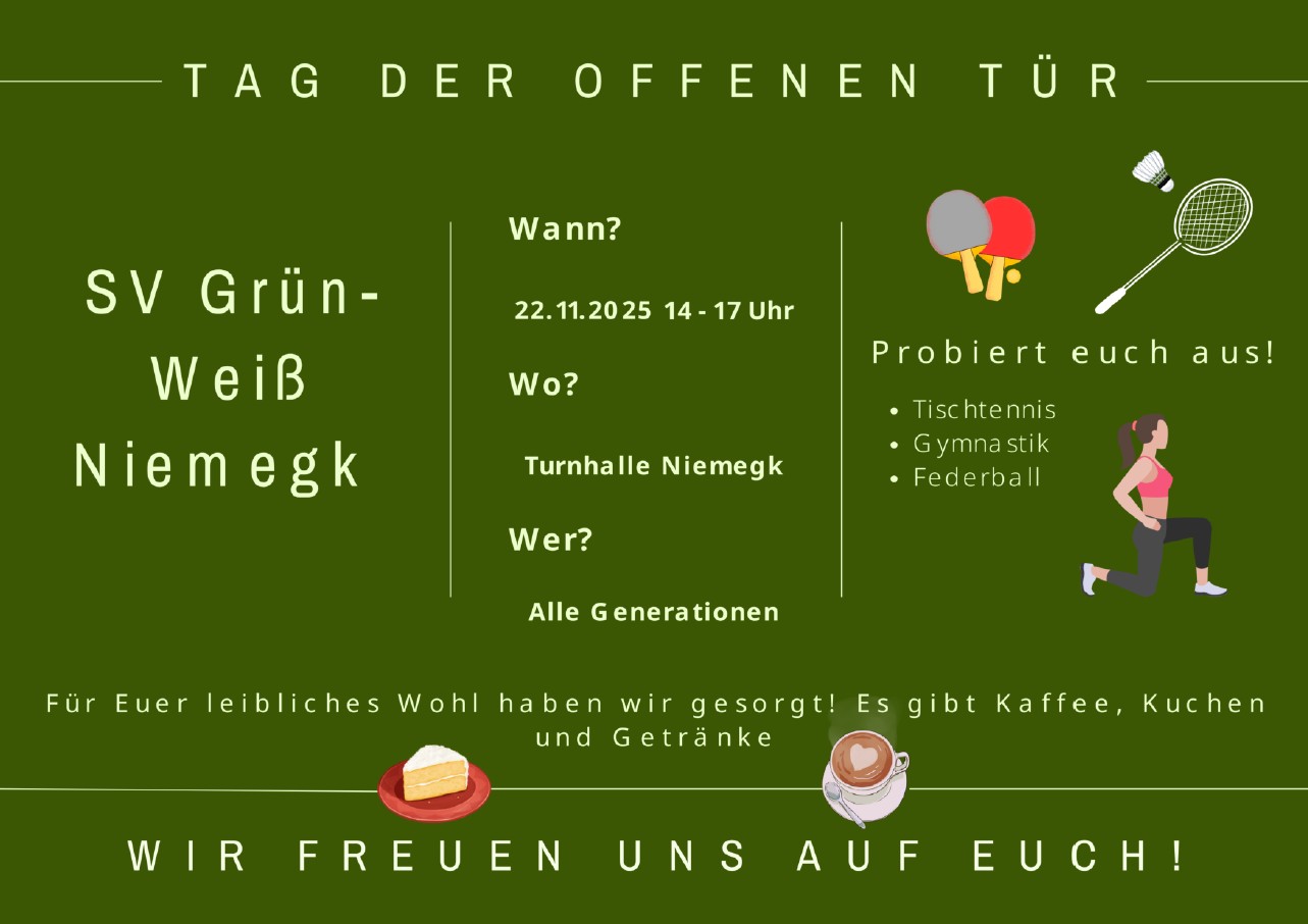 Am Samstag, den 22. November 2025, öffnet die Turnhalle in Niemegk ihre Türen für alle Sportbegeisterten und solche, die es noch werden wollen. Der SV Grün-Weiß Niemegk e.V. lädt herzlich zum Tag der offenen Tür ein. Von 14:00 bis 17:00 Uhr erwartet die Besucher ein buntes Programm zum Mitmachen, Ausprobieren und Kennenlernen.