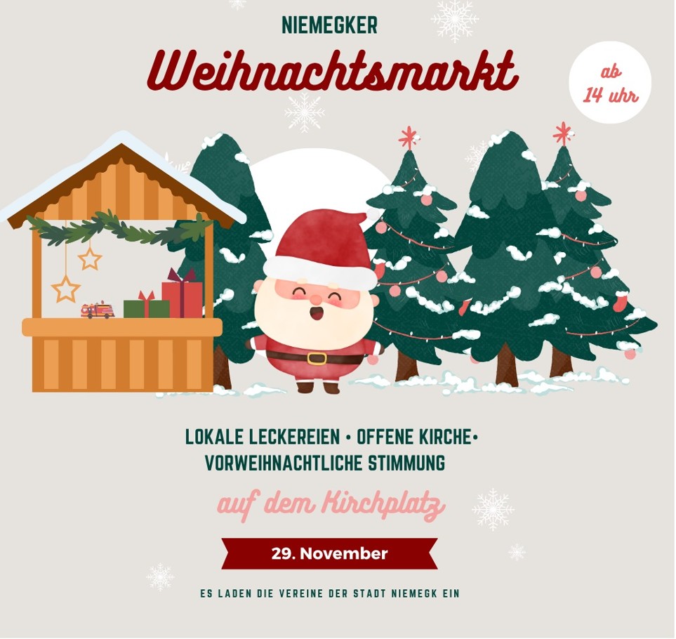 Weihnachtsmarkt in Niemegk + Zu Google Kalender hinzufügen + iCal / Outlook exportieren Datum 29. November 2025 (Samstag) Abgelaufen! Uhrzeit 14:00 - 18:00 Standort Feuerwehr Niemegk Mühlenstraße 2, 14823 Niemegk (Eingang links, 2. OG) Teile diese Veranstaltung