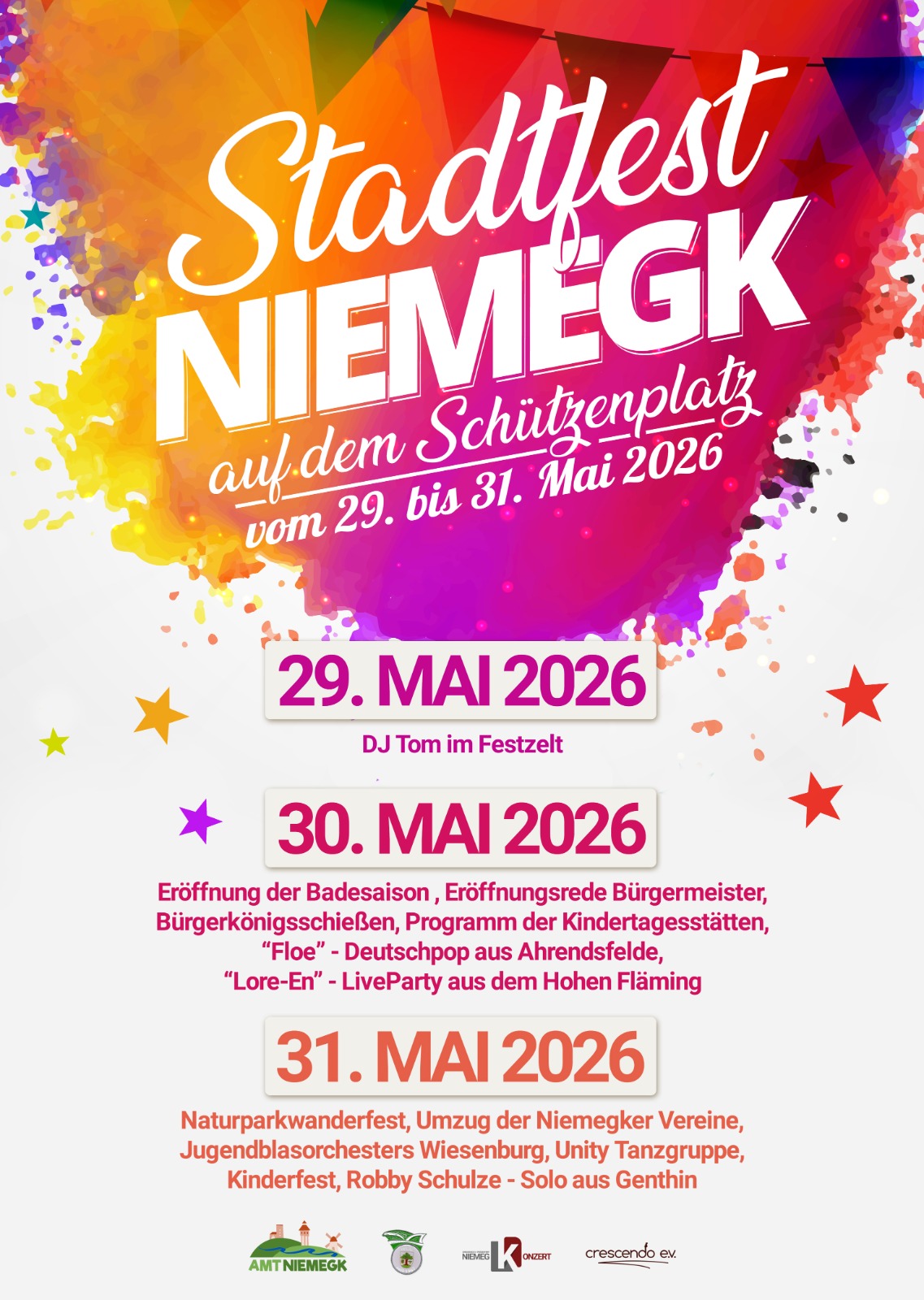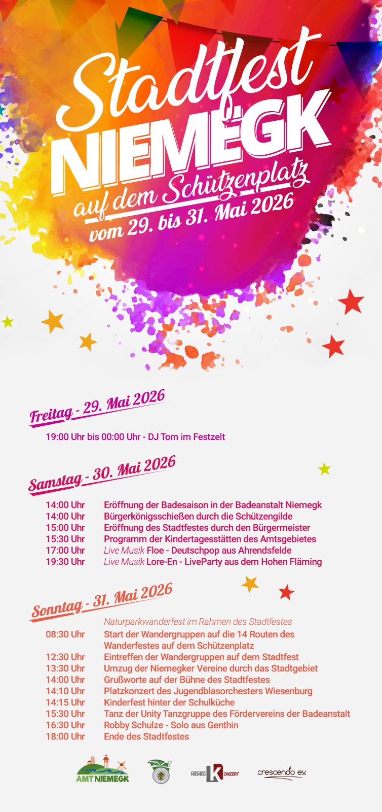 Das vollständige Programm ist dem aktuellen Flyer zu entnehmen. Schon jetzt ist die Vorfreude groß: Das Stadtfest 2026 in Niemegk verspricht erneut ein unvergessliches Erlebnis für die ganze Familie zu werden.